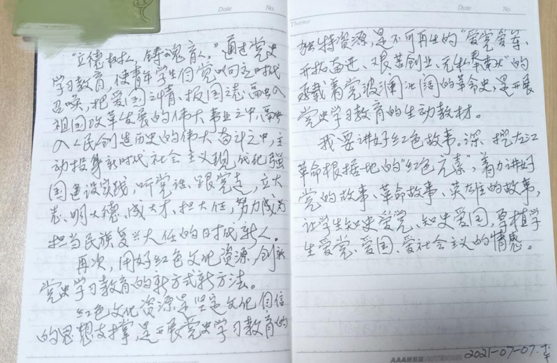 潘老师是位和蔼可亲的瘦小老人,他虽然退休多年,但还在义务帮助有需要的退休老师审稿。潘老师的学党史读书笔记里写道:“立德树人、铸魂育人”。通过党史学习教育,使青年学生自觉响应时代召唤,把爱国之情、报国之志融入祖国改革发展的伟大事业之中,融入人民创造历史的伟大奋斗之中,主动投身新时代社会主义现代化强国建设实践,听党话跟党走,立大志铭大德,成大才担大任。创新党史学习教育的新方式新方法,用好红色文化资源。红色文化资源是坚定文化自信的思想支撑,承载着党波澜壮阔的革命史,是开展党史学习教育的生动教材。