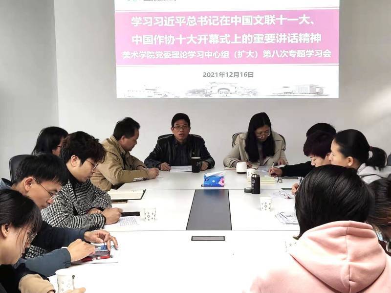 近日,中国文联十一大、中国作协十大在北京人民大会堂开幕,习近平总书记出席大会并发表重要讲话,为完整、准确、全面、系统学习贯彻领会习近平总书记的重要讲话精神。12月16日,美术学院党委在雁山校区纯道楼3-A208召开2021年理论学习中心组(扩大)第八次集中学习会暨党暨学习习近平总书记在中国文联十一大、中国作协十大开幕式上的重要讲话精神。学院领导班子、党委委员、纪委委员、办公室主任、专职组织员和各党支部书记参加会议。