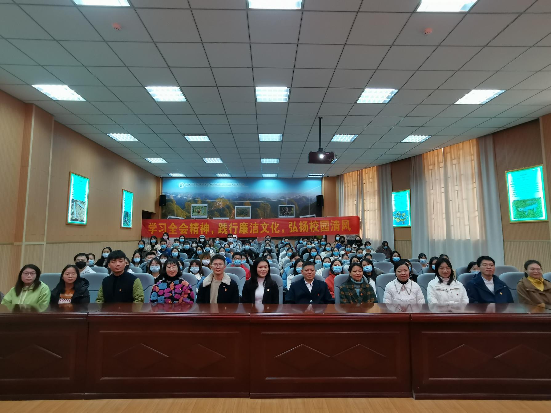 本次活动结合12·9国际反腐败日,观看中央纪委宣传部和中央电视台联合制作的反腐专题片《永远在路上》,并邀请党员同志分享学习体会,开展师生共同在“学习全会精神,践行廉洁文化,弘扬校园清风”横幅上签字等环节。