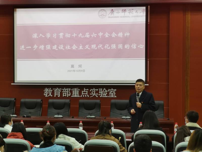 近日,生命科学学院、外国语学院学习贯彻党的十九届六中全会及自治区第十二次党代会精神报告会在伯康楼112报告厅顺利举行,校党委常委莫坷出席并作报告,生命科学学院及外国语学院100余名师生党团员代表及班级代表参加。
