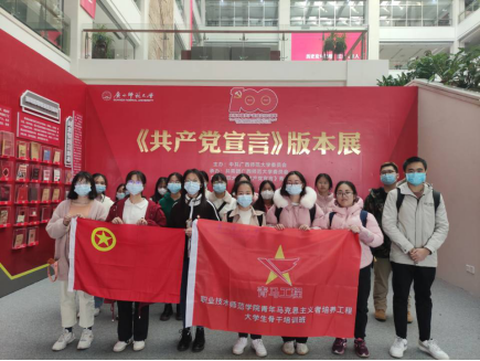 为持续推进党史学习教育,传承红色革命基因,12月17日,职业技术师范学院2021年青马班学员走进雁山校区图书馆,参观了《共产党宣言》版本展。
