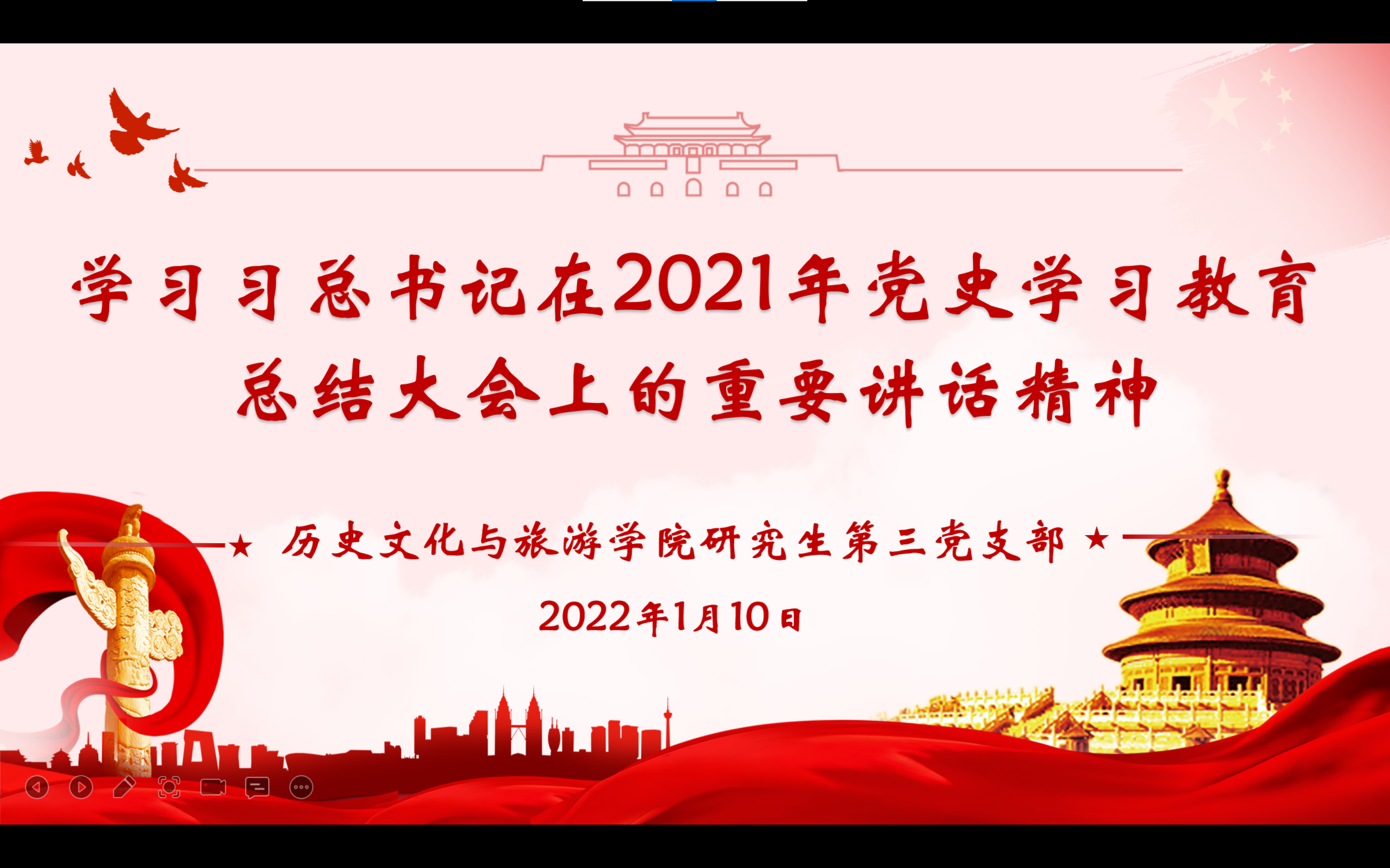 为深入推进党史学习教育走深走实,切实抓好支部党员队伍建设。历史文化与旅游学院研究生第三党支部于1月10日19:30线上开展组织生活会暨一月主题党日活动。支部全体成员参加本次活动,活动由组织委员路博娣主持。