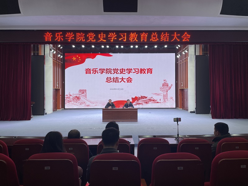 1月14日,音乐学院党委于音乐楼三楼综合厅召开党史学习教育总结大会。学院党政领导班子、各支部书记、部分教师党员代表到场参会,全体学生党员线上参加会议。会议由学院党委相关负责人主持。