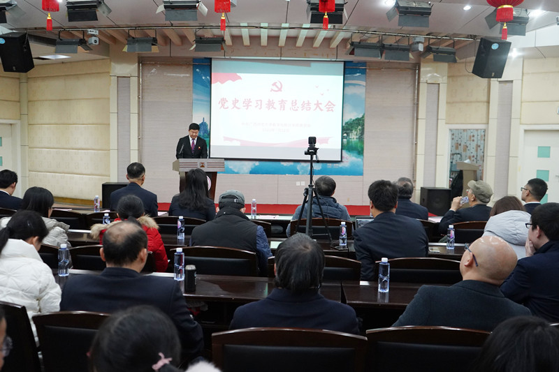 党史学习教育总结大会现场还举行了教工预备党员入党宣誓仪式,学院离退休教职工党员代表、原广西师范大学副校长、“光荣在党50年”纪念章获得者、离退休数学党支部书记江佑霖同志领誓并讲话。江佑霖同志简要重温了中国共产党的百年奋斗历程,并分享了在学院建设发展的艰难时期,学院全体教职工如何凝心聚力攻坚克难,党员如何发挥先锋模范作用助力学院攻克难关的事迹,以此激励全体教职工立足岗位、奋勇争先,在新时代、新形势中闯出高质量的发展道路。他指出,党史是一部蓬勃伟力的奋斗史,是一部不断战胜困难、创造奇迹的历史。党史学习教育是一次全面深刻的政治教育、思想淬炼、精神洗礼,全体党员应以此为契机,不断淬炼过硬党性,在助力学院破解发展难题、厚植发展优势中当先锋。