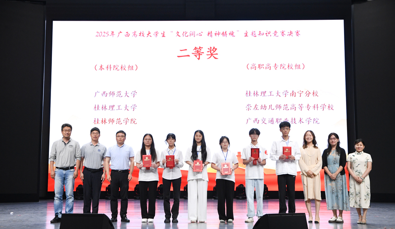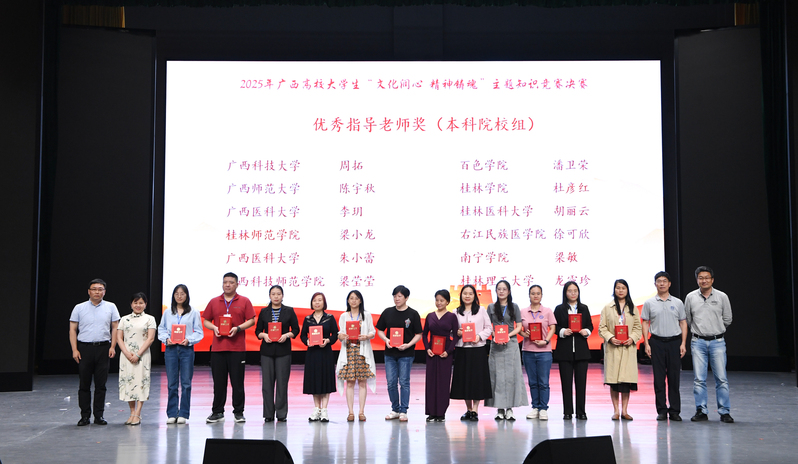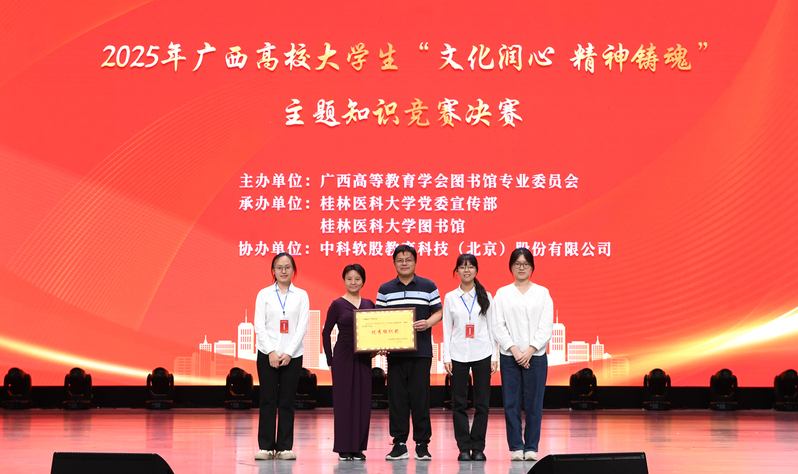 5月24日,由广西高等教育学会图书馆专业委员会主办、桂林医科大学党委宣传部及图书馆承办、中科软股教育科技(北京)股份有限公司协办的广西高校大学生文化润心 精神铸魂主题知识竞赛总决赛在桂林医科大学圆满落幕。经过激烈角逐,我校代表队以总分200分的优异成绩荣获本科院校组二等奖,我校图书馆同时荣获优秀组织奖及优秀指导老师奖两项殊荣,充分彰显了我校在文化育人领域的综合实力。
