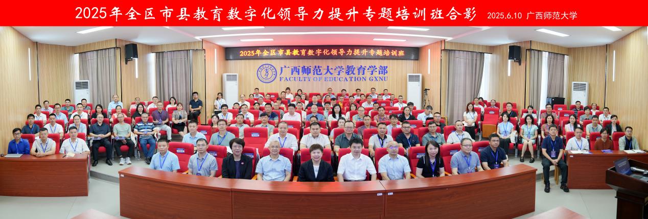 6月10日,由广西壮族自治区教育厅主办、广西师范大学承办,广西师范大学教育学部、广西教育信息化发展研究中心作为专业支撑的2025年全区市县教育数字化领导力提升专题研修班顺利启动。广西师范大学党委常委副校长汤志华教授,广西壮族自治区教育厅教育信息化管理处魏莹莹处长,深圳大学教育学部副主任、智能教育研究中心主任曹晓明教授,广西教育信息化发展研究中心常务副主任、教育区块链与智能技术教育部重点实验室副主任袁磊教授出席会议。会议由广西师范大学教育学部常务副部长叶蓓蓓教授主持。广西各市县的126名教育行政部门负责人、数字化教育骨干参与本次培训。