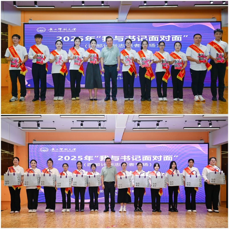 活动现场洋溢着浓浓的惜别之情,氛围温馨感人。贺祖斌为志愿者代表赠送《习近平的七年知青岁月》《西迁记忆:广西师范大学抗战迁徙办学史迹(1944-1946)》《一蓑烟雨任平生》等书籍,寄语同学们从中汲取奋进力量。沈星灿解读特别准备的“逐梦行囊”中每件礼物的内涵寓意,表达学校对志愿者们的殷切关怀与美好祝愿。