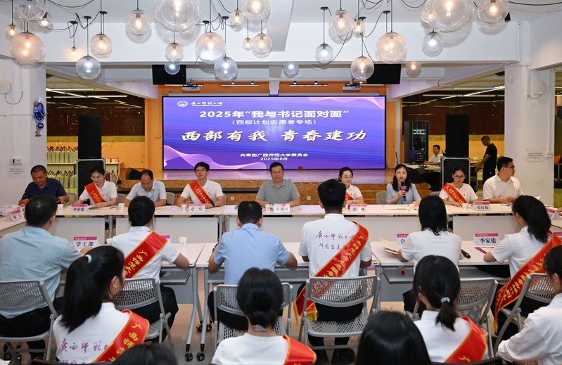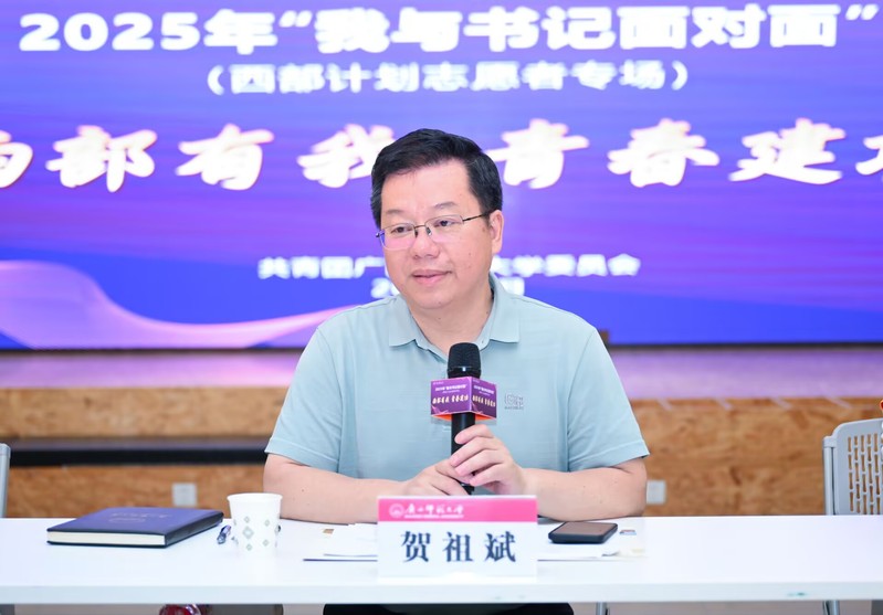 6月18日上午,我校2025年“我与书记面对面”西部计划志愿者专场活动在雁山校区举行。校党委书记贺祖斌与30余名即将奔赴西部基层的西部计划志愿者代表亲切座谈,勉励大家坚定理想信念,练就过硬本领,在祖国最需要的地方绽放绚丽的青春之花。校党委常委、副校长沈星灿主持活动,校党委常委谭智雄、毛立刚出席活动。