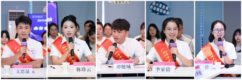 活动上,即将奔赴贵州福泉和广西富川支教,及赴新疆、云南元阳、广西横州服务的5名志愿者代表分别结合自己在校期间的学习、生活、工作等谈感受、话憧憬。