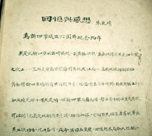 朱克靖《回忆与感谢——为新四军成立六周年纪念而作》